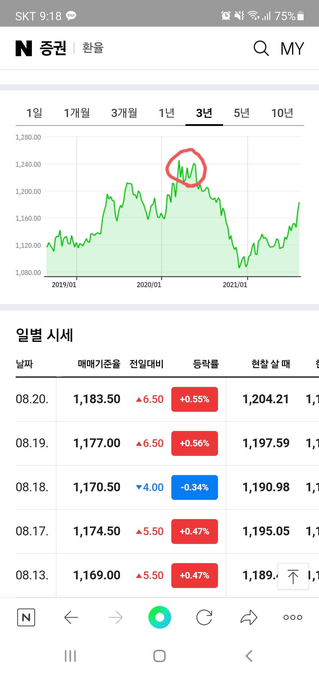 3년 그래프를 보면 저 꼭지점이 20년 2~3월 쯤 주식이 제일 저점일 때를 나타낸다
