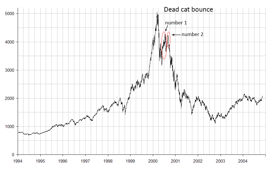 "높은 곳에서 떨어 뜨리면 죽은 고양이도 튀어오른다."(Even a dead cat will bounce if it falls from a great height)